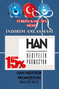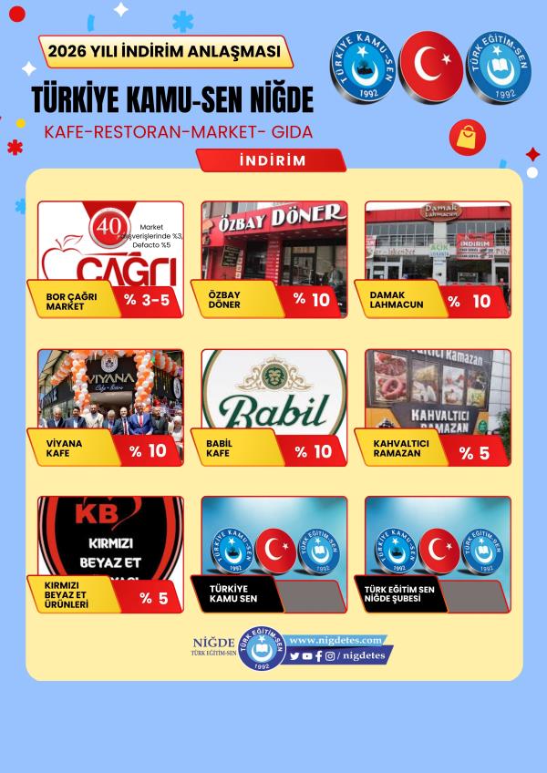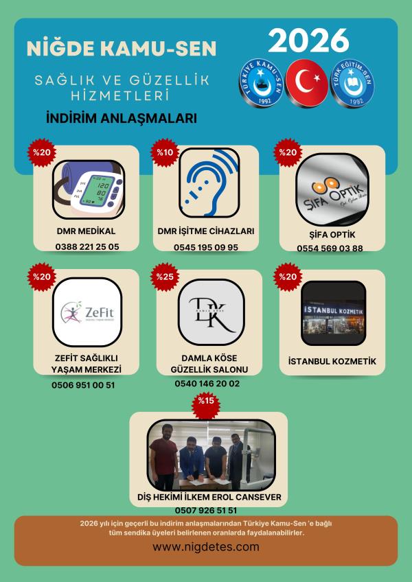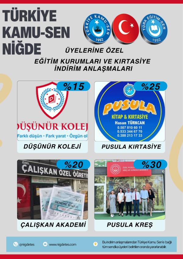 Niğde'de faaliyet gösteren aşağıdaki firmalar ile Türkiye Kamu-Sen Konfederasyonu olarak üyelerimiz adına indirim antlaşması devam etmektedir.