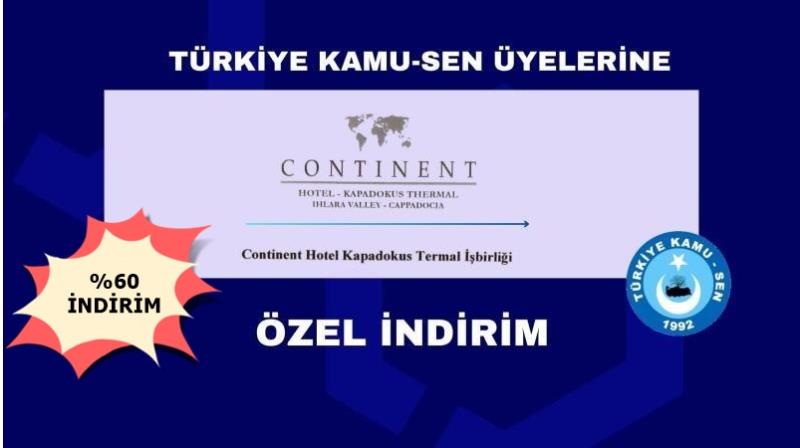 Aksaray Ihlara'da faaliyet gösteren CONTİNENT HOTEL KAPADOKUS TERMAL, Türkiye Kamu-Sen üyelerine özel indirim uygulamaktadır.