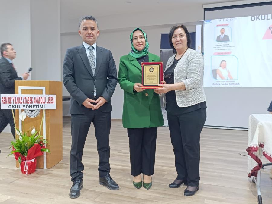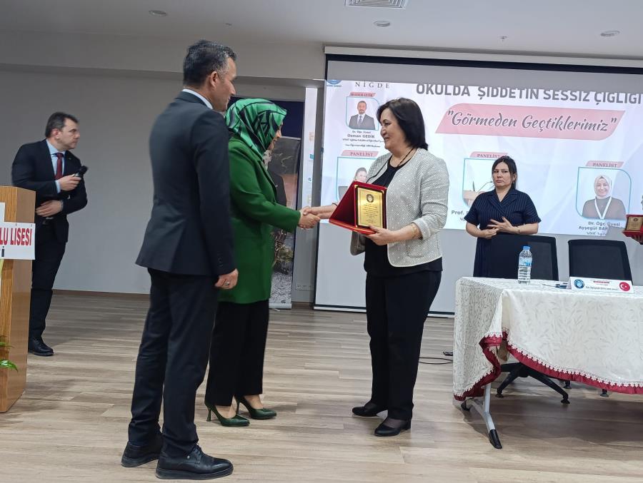 Eğitimcilerin ve öğrencilerin yoğun ilgi gösterdiği panelin sonunda, Niğde İl Milli Eğitim Müdürü Sayın Elif Özbek ve protokol üyeleri tarafından, değerli katkılarından dolayı panelistlere ve moderatöre plaket takdim edildi. Program, okullarda daha güvenli ve huzurlu bir eğitim ortamı için iş birliği mesajlarıyla sona erdi.